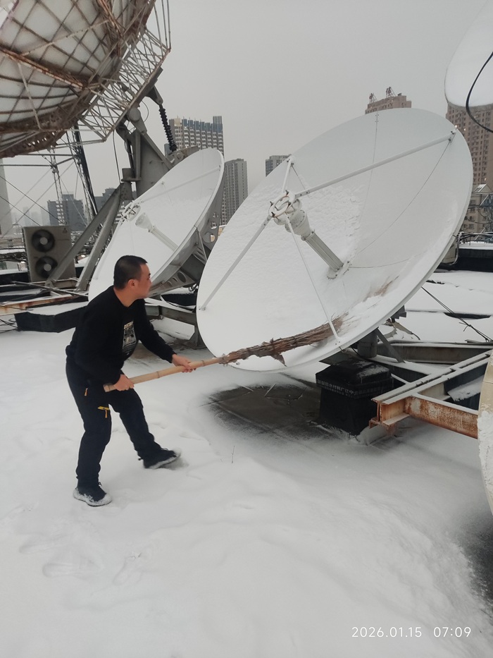 1月15日清晨,位于抚顺公司顶楼的卫星天线被皑皑白雪覆盖。天线上的冰雪会严重阻碍信号的正常接收。为了保证卫星接收的电视信号能够优质、稳定地回传到省公司,运行维护部值班人员胡彧凯在寒风中紧急清扫天线上的积雪。天寒地冻,他每隔一段时间就进行一次清扫,确保信号传输不受影响。这份坚守,正是无数有线电视工作者在岗位上默默付出的缩影,他们用行动守护着信息传输的畅通,保障着千家万户的正常收视。